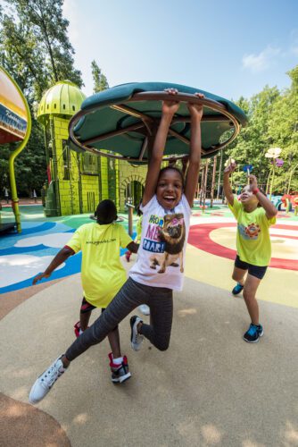 The playground also incorporates a full suite of Rhapsody® Outdoor Musical Instruments—including metallophones, chimes, and drums—that encourage creativity, rhythm, and intergenerational play. Safety and accessibility are enhanced through Surface America’s PlayBound™ Poured-in-Place surfacing, a 3.5-inch thick system meeting an 8-foot critical fall height. Installed in 100% color with 17 vibrant shades, Wizard of Oz-themed graphics, and durable aliphatic binder, the surfacing enhances both safety and storytelling through its vivid design.
